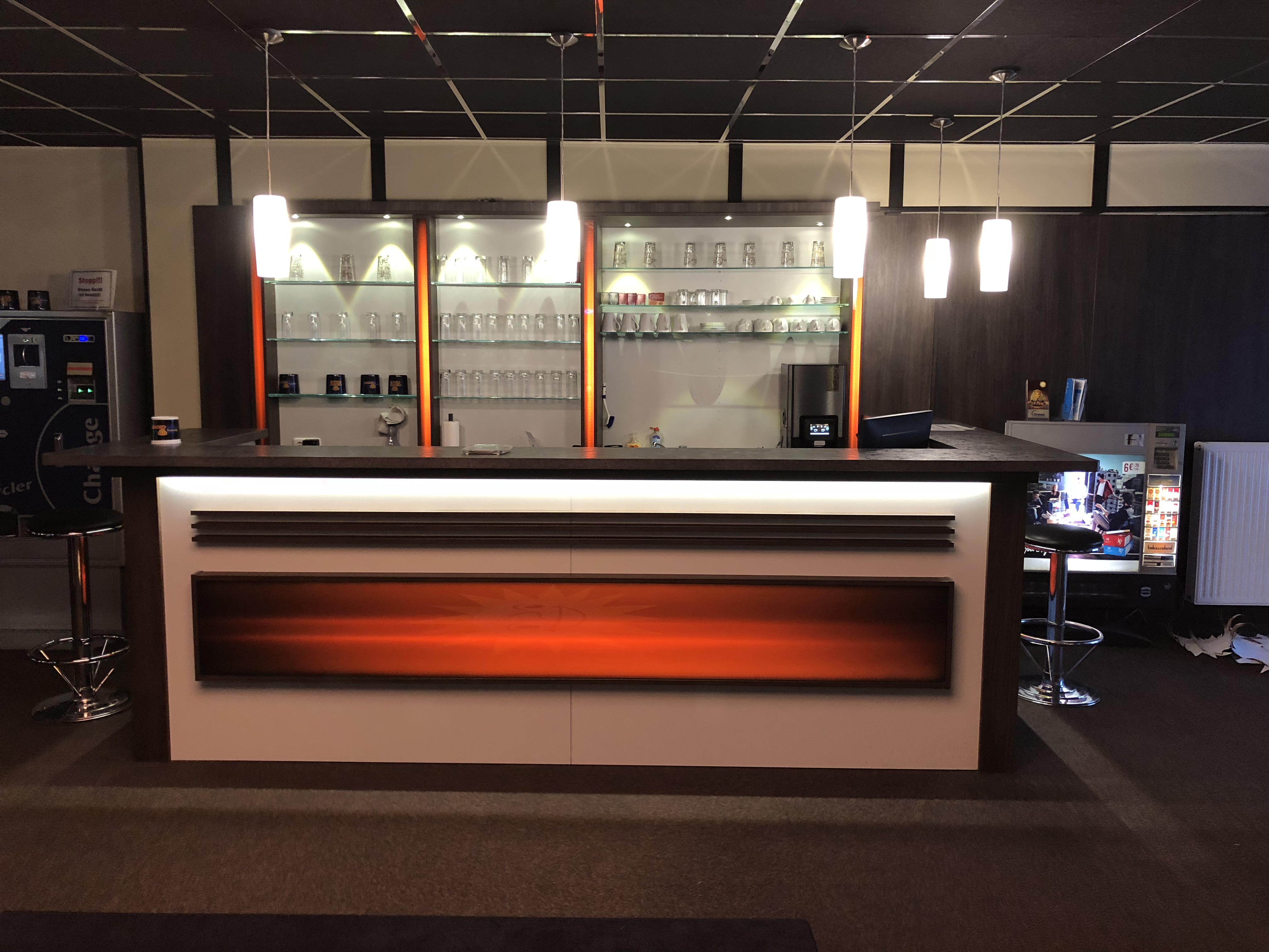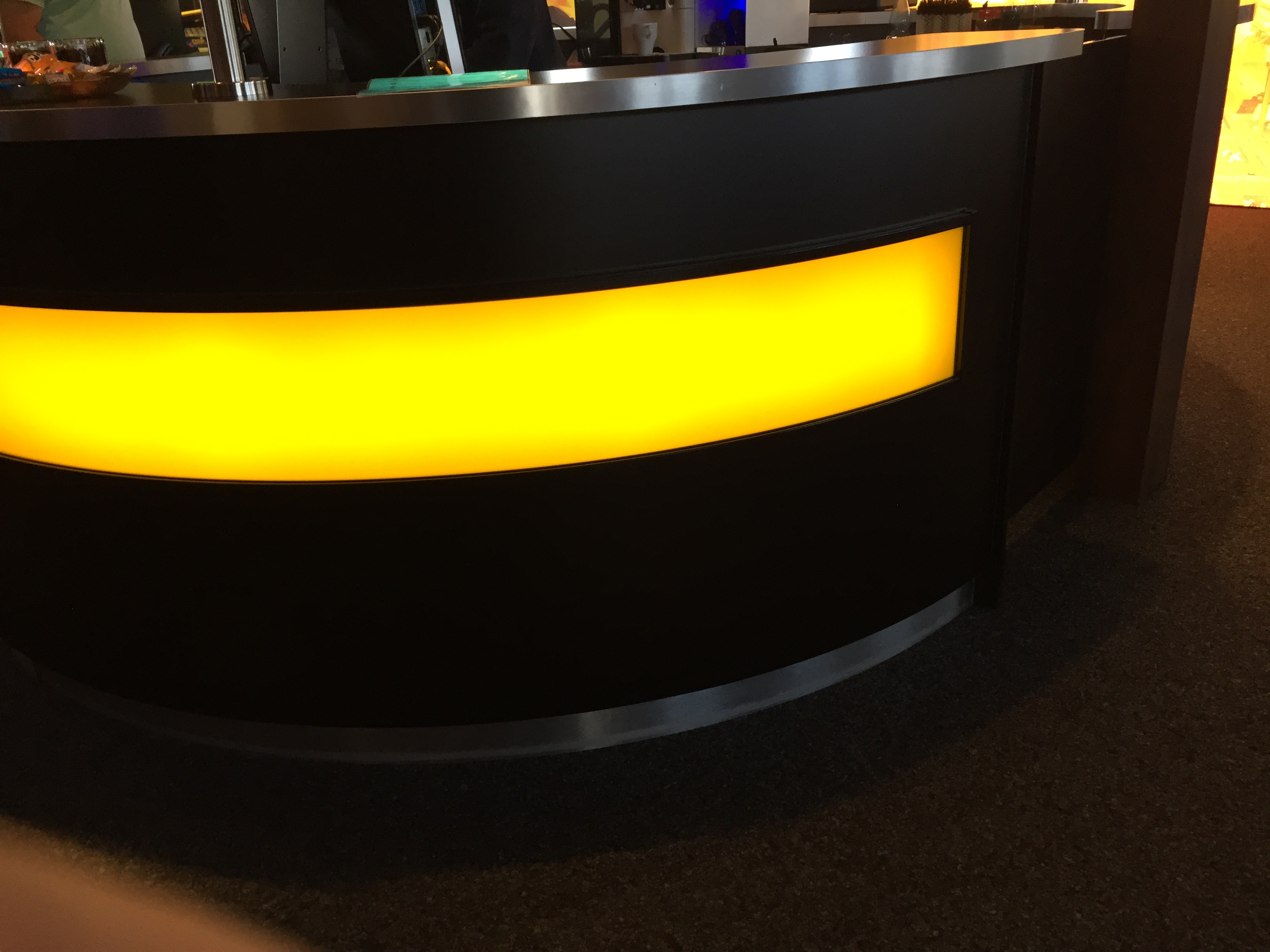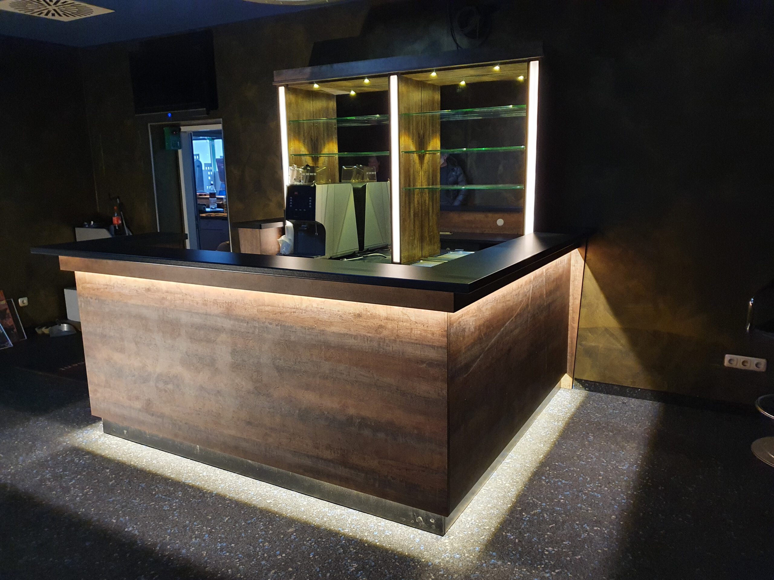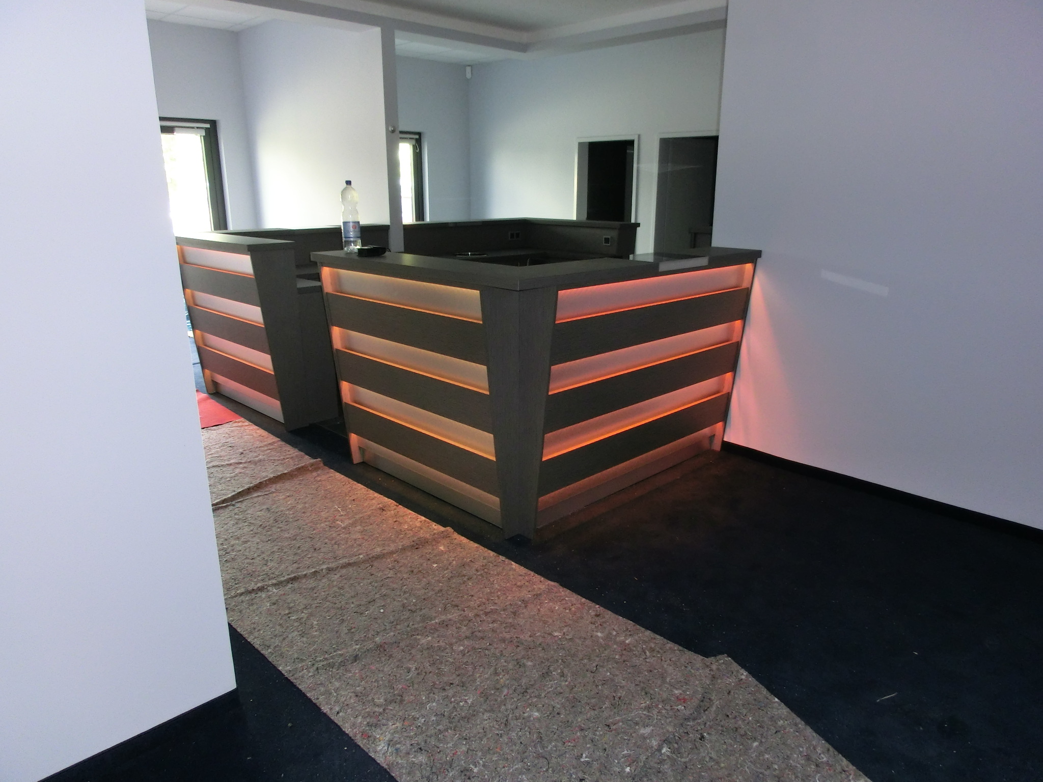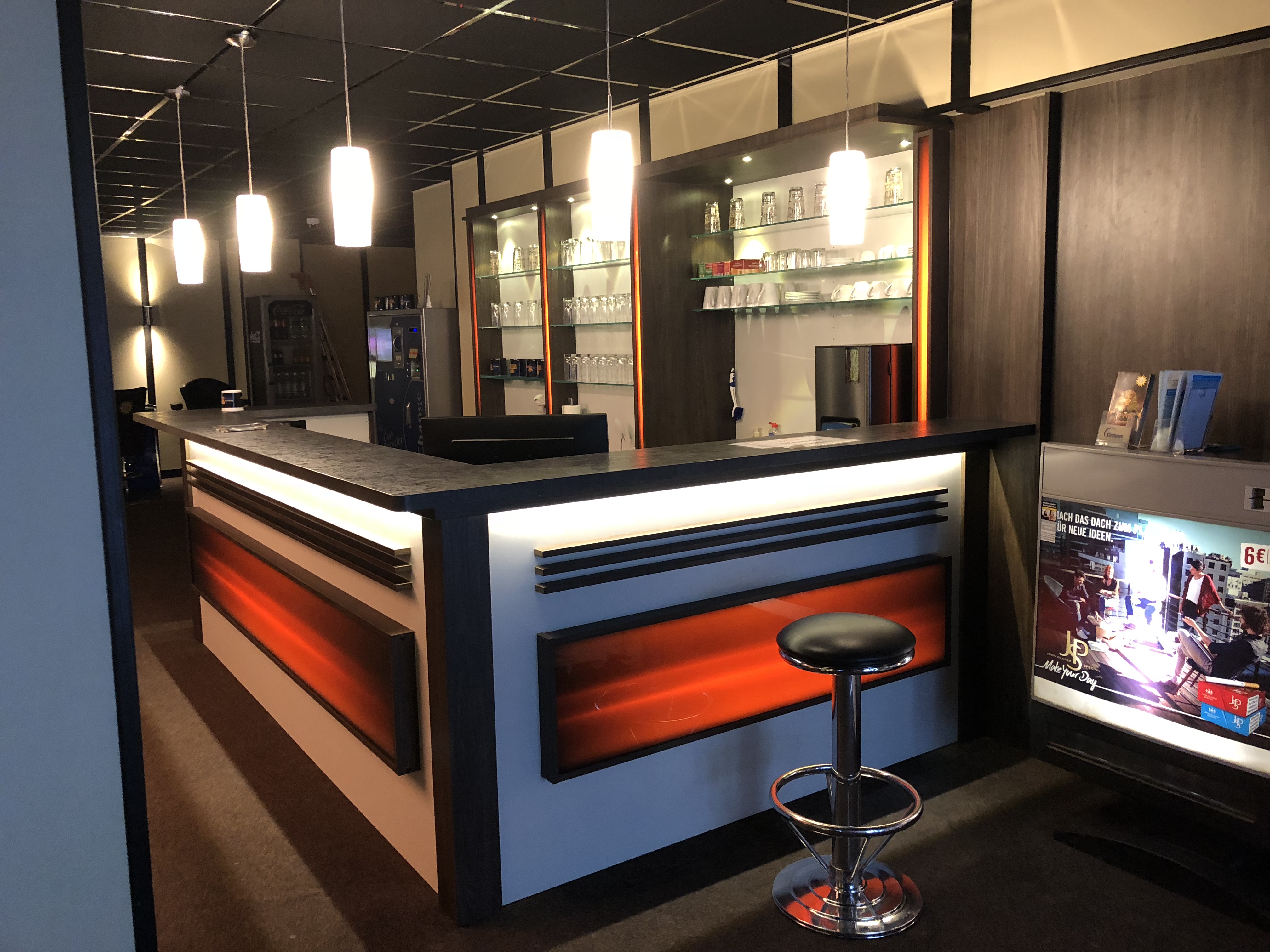 - Tresen mit Rundung und hinterleuchteter Acrylglasfont