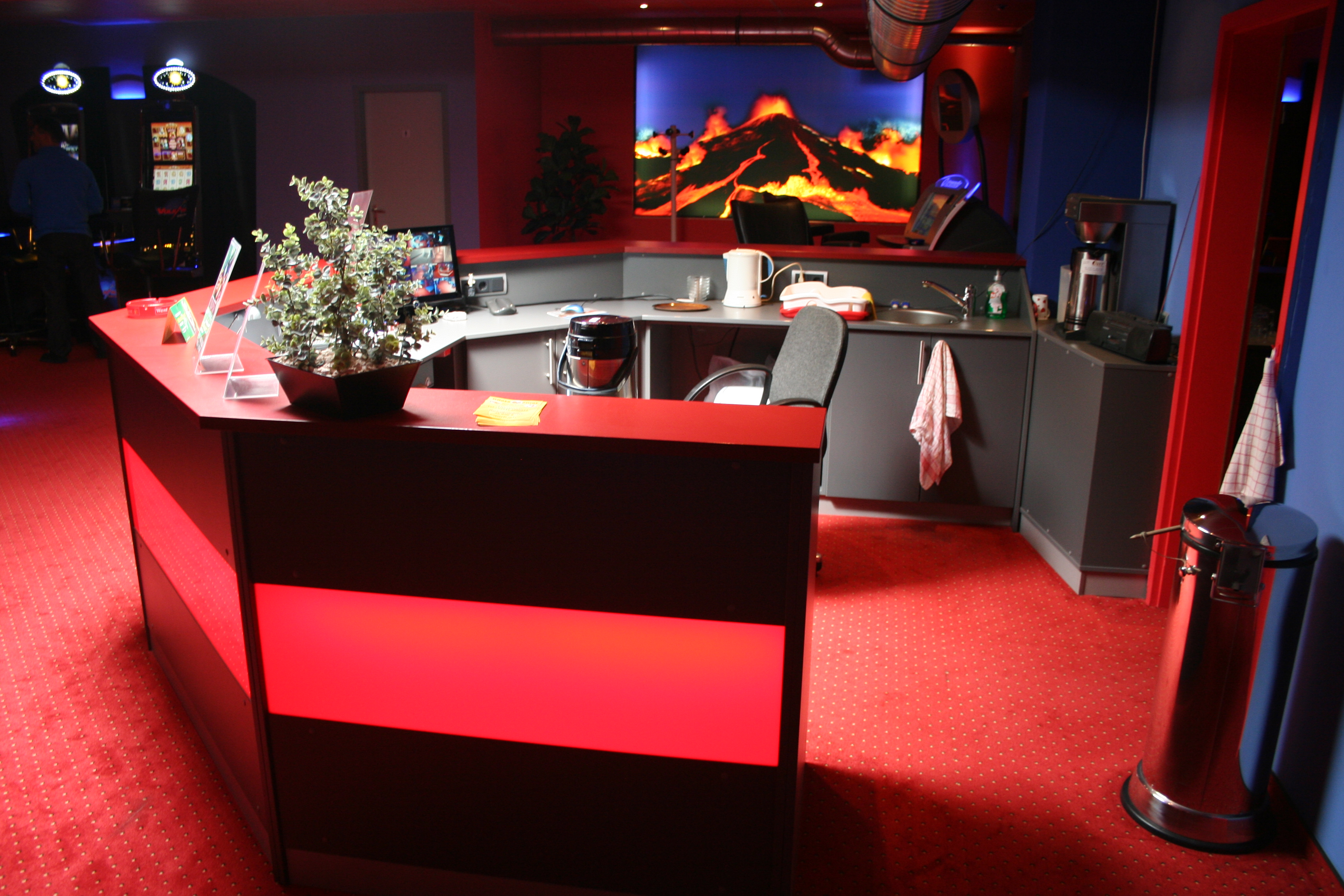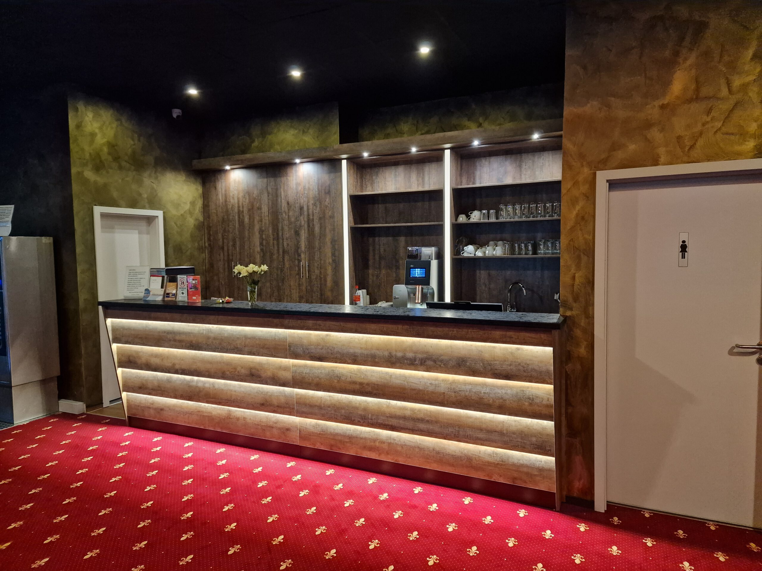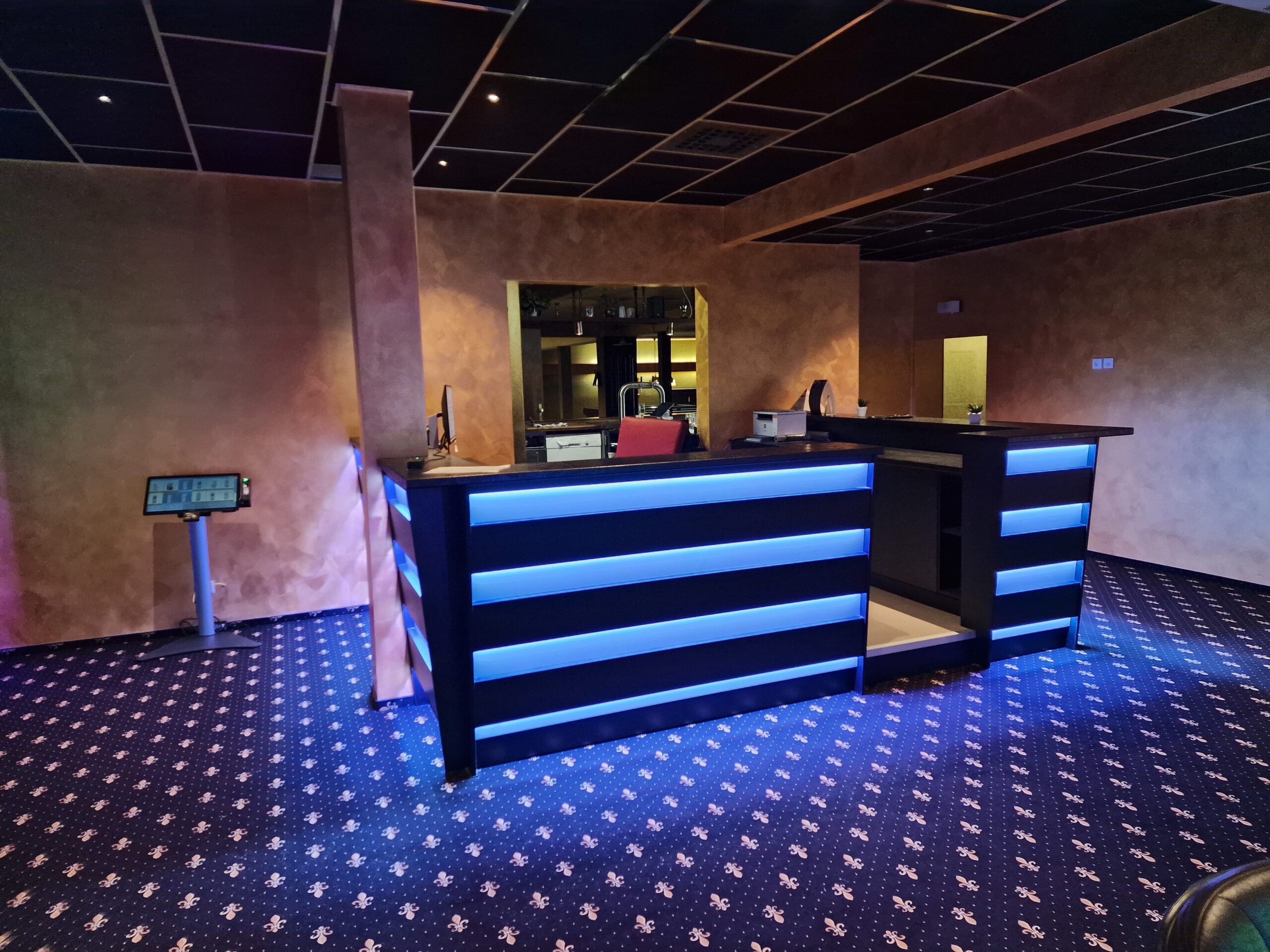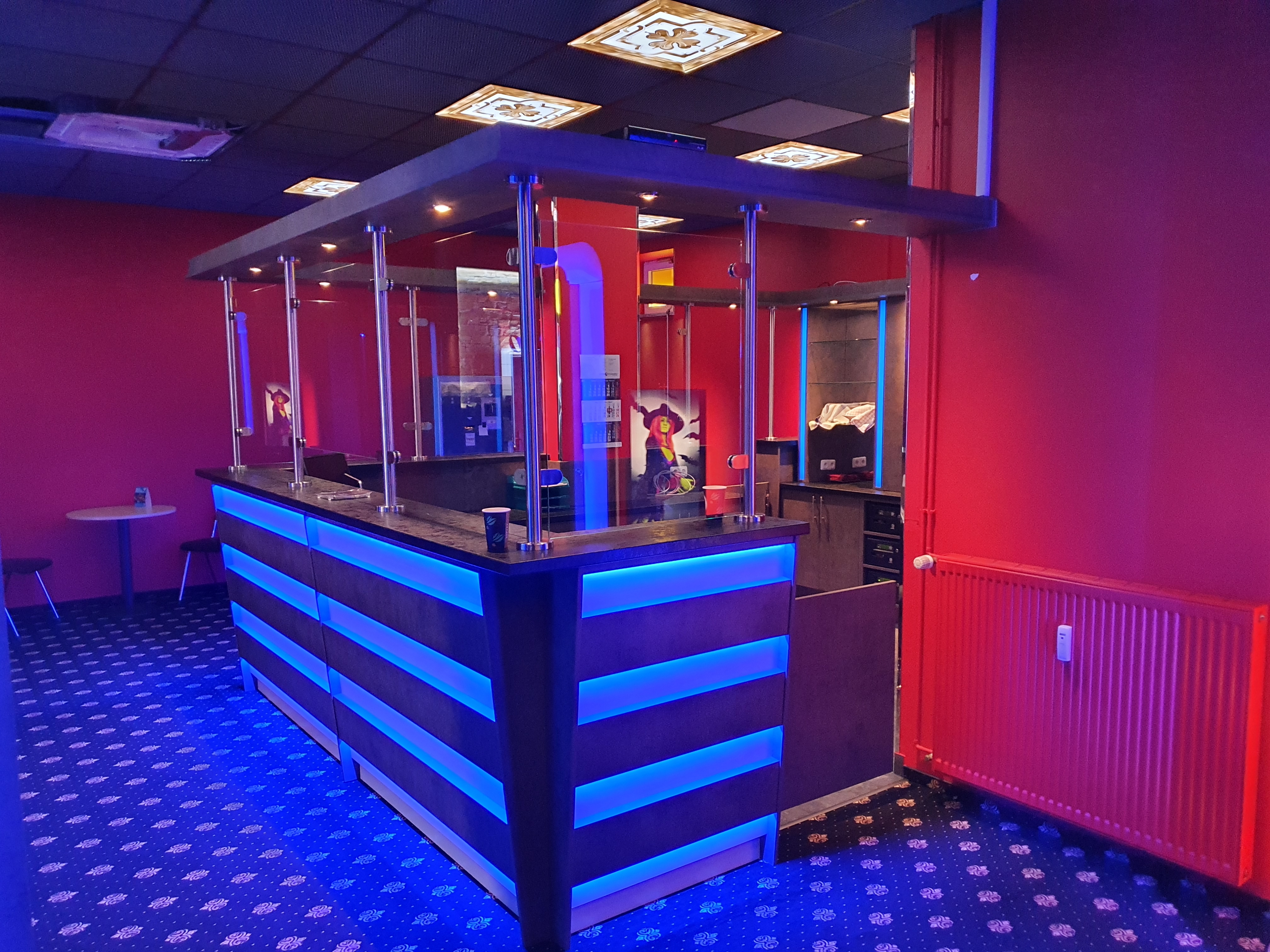 - Tresen, eckig, beleuchtete Felder und Deckenkranz