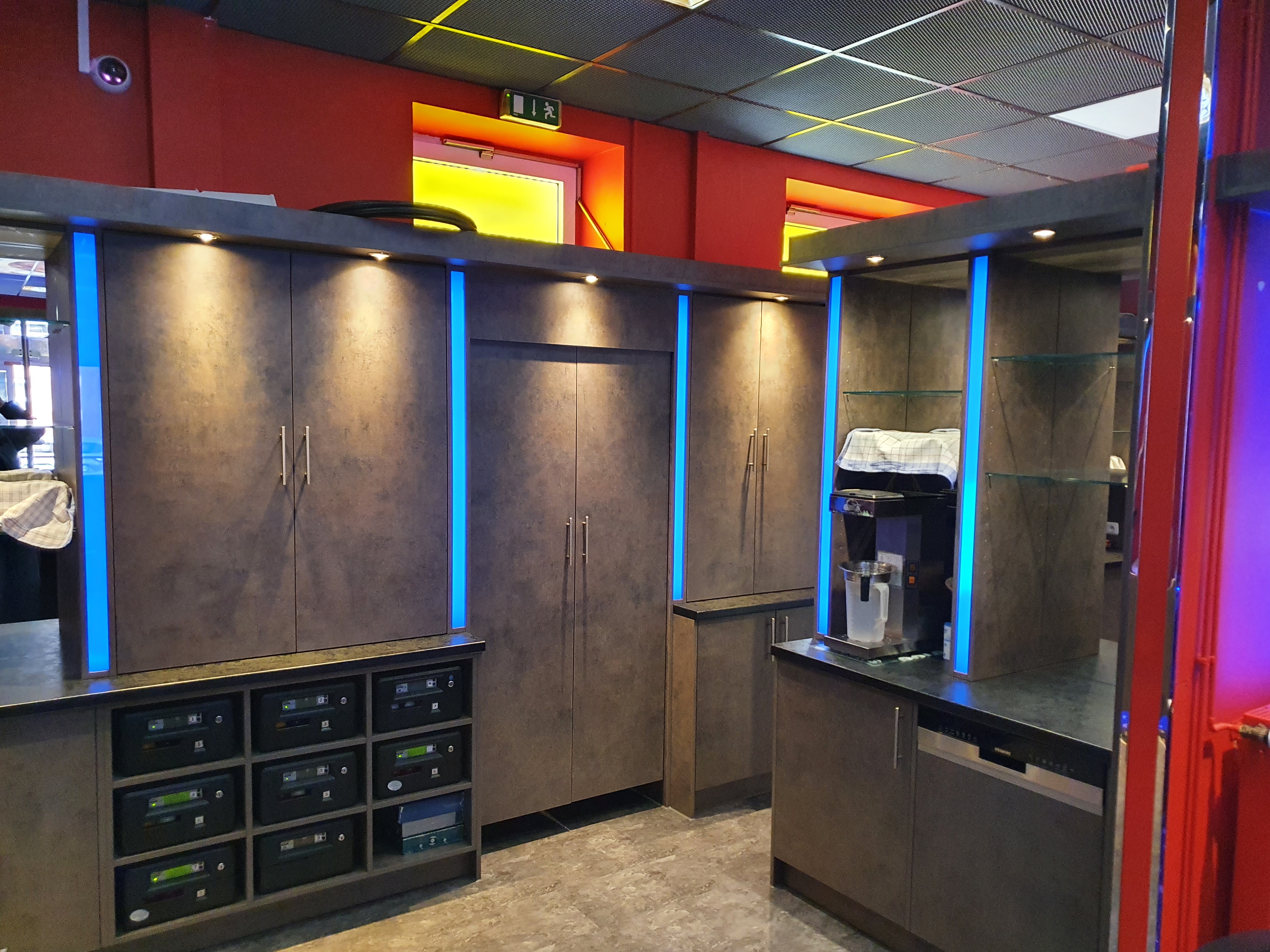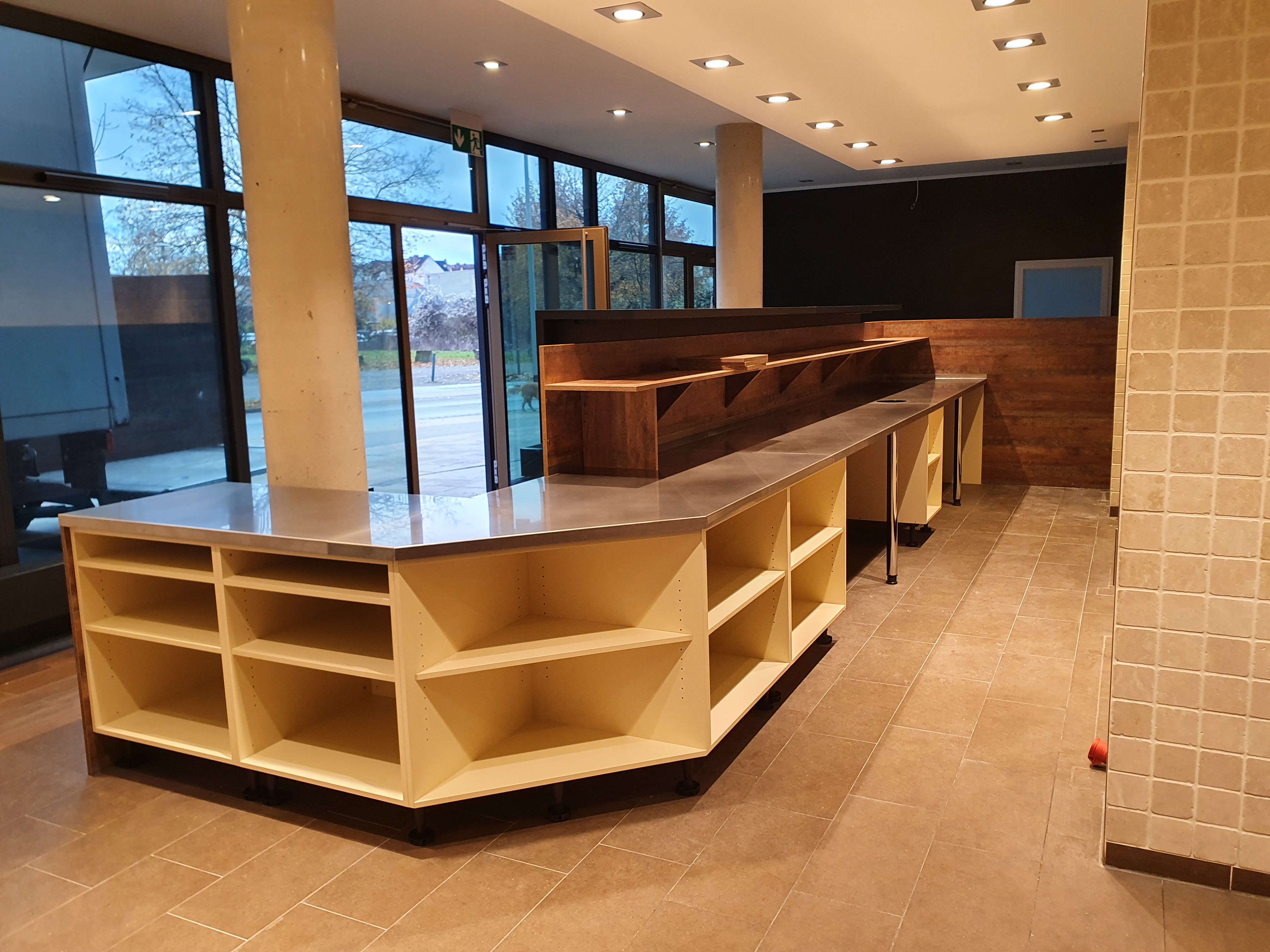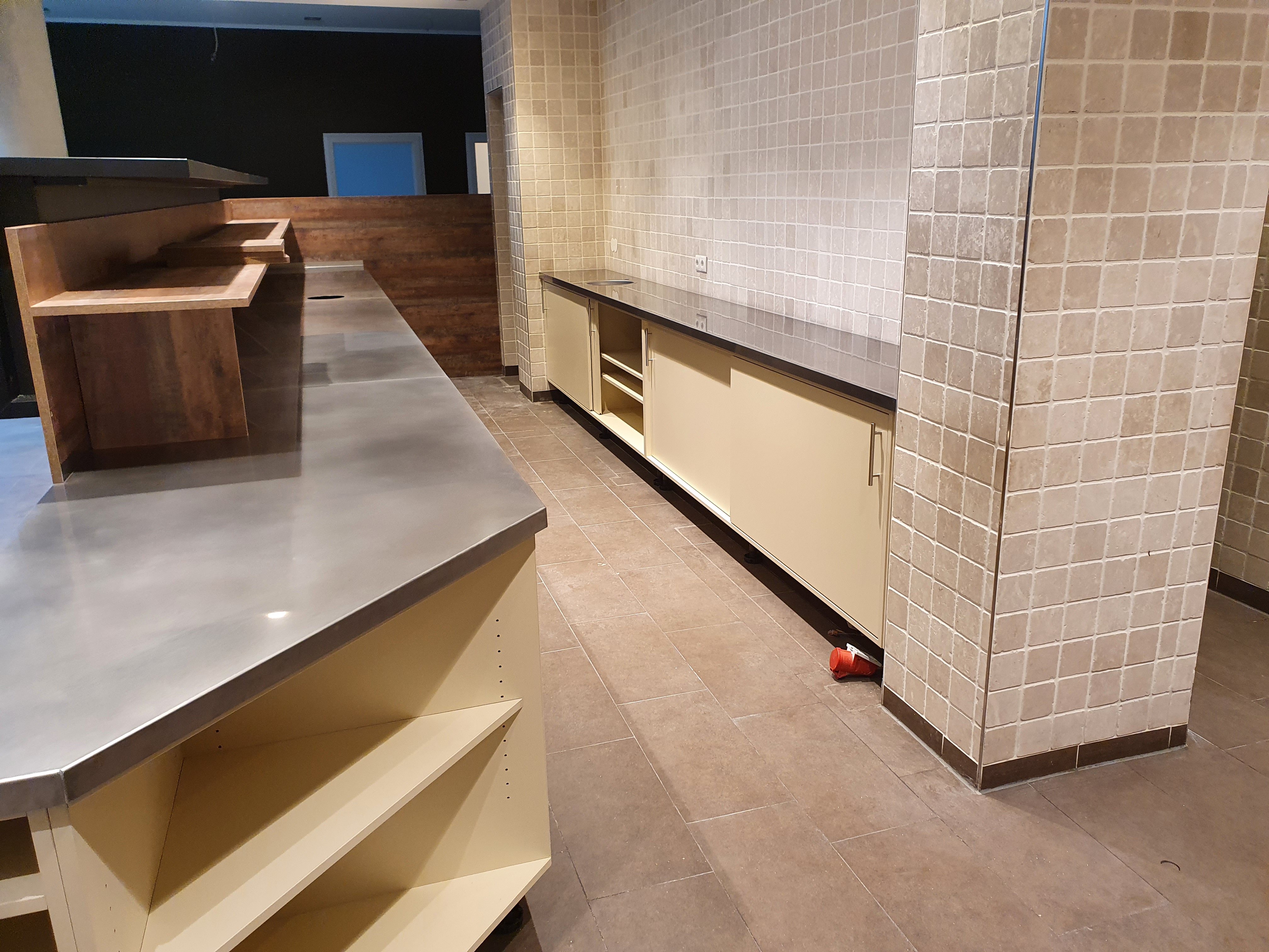- Tresen mit eingelassenen Edelstahlstreifen und Deckenabhängung mit Beleuchtungselement