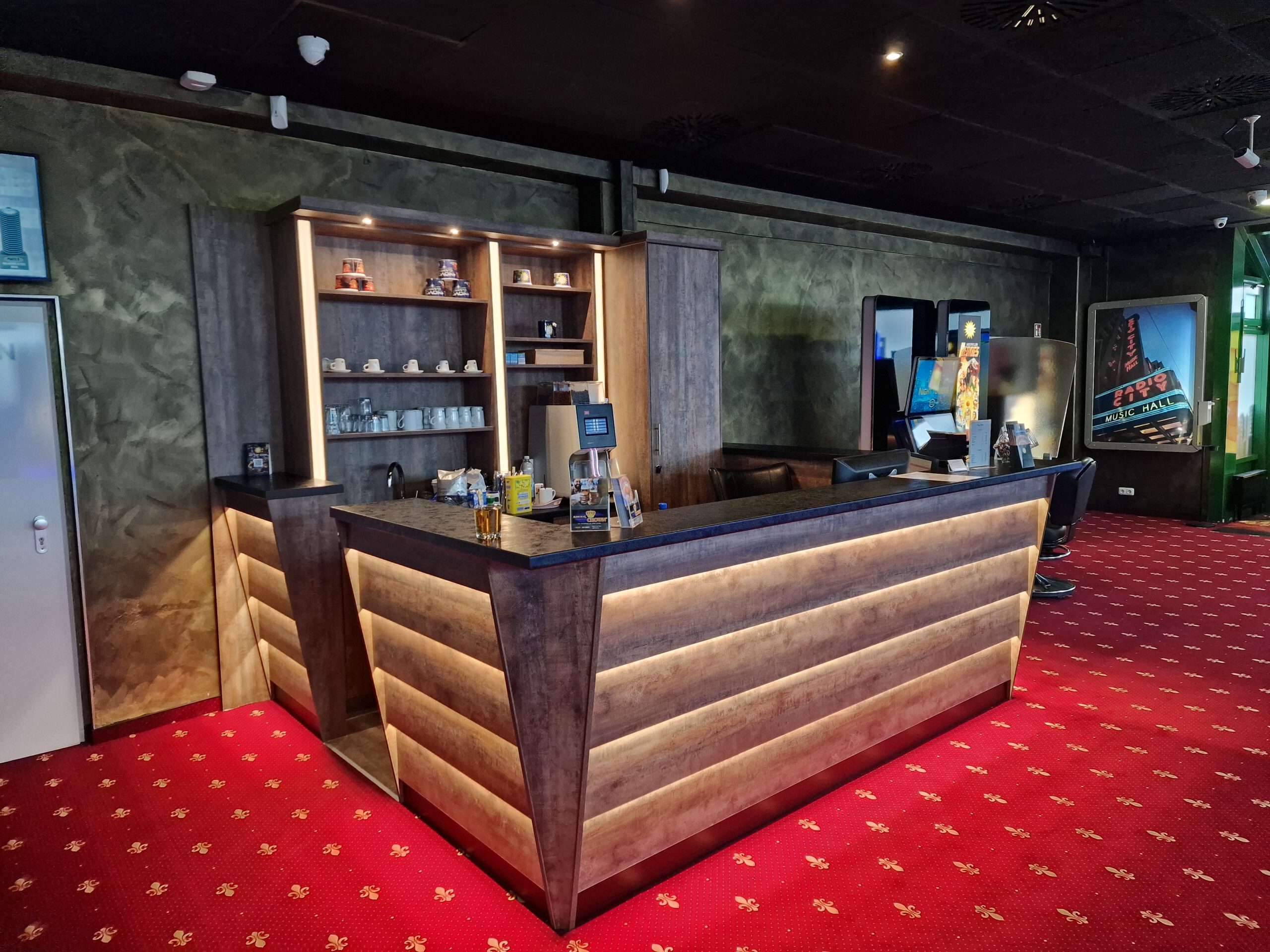 - Tresen, eckig mit einzelnen beleuchteten Feldern, Deckenkranz und Rückbuffet
