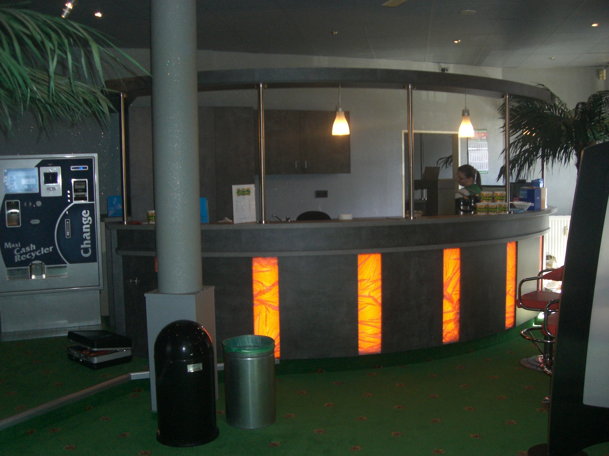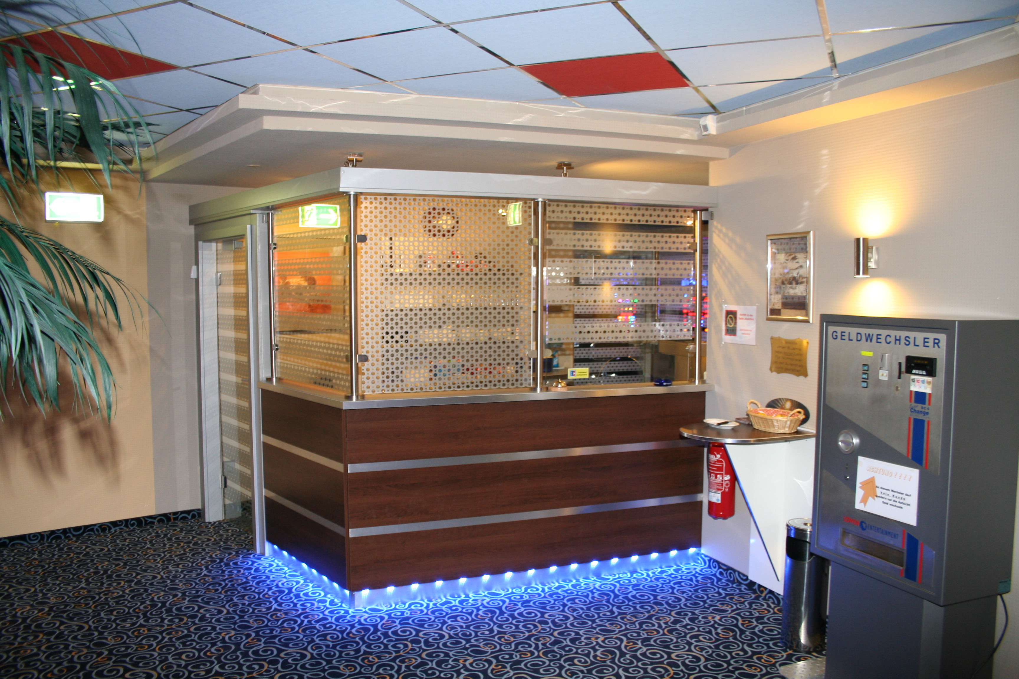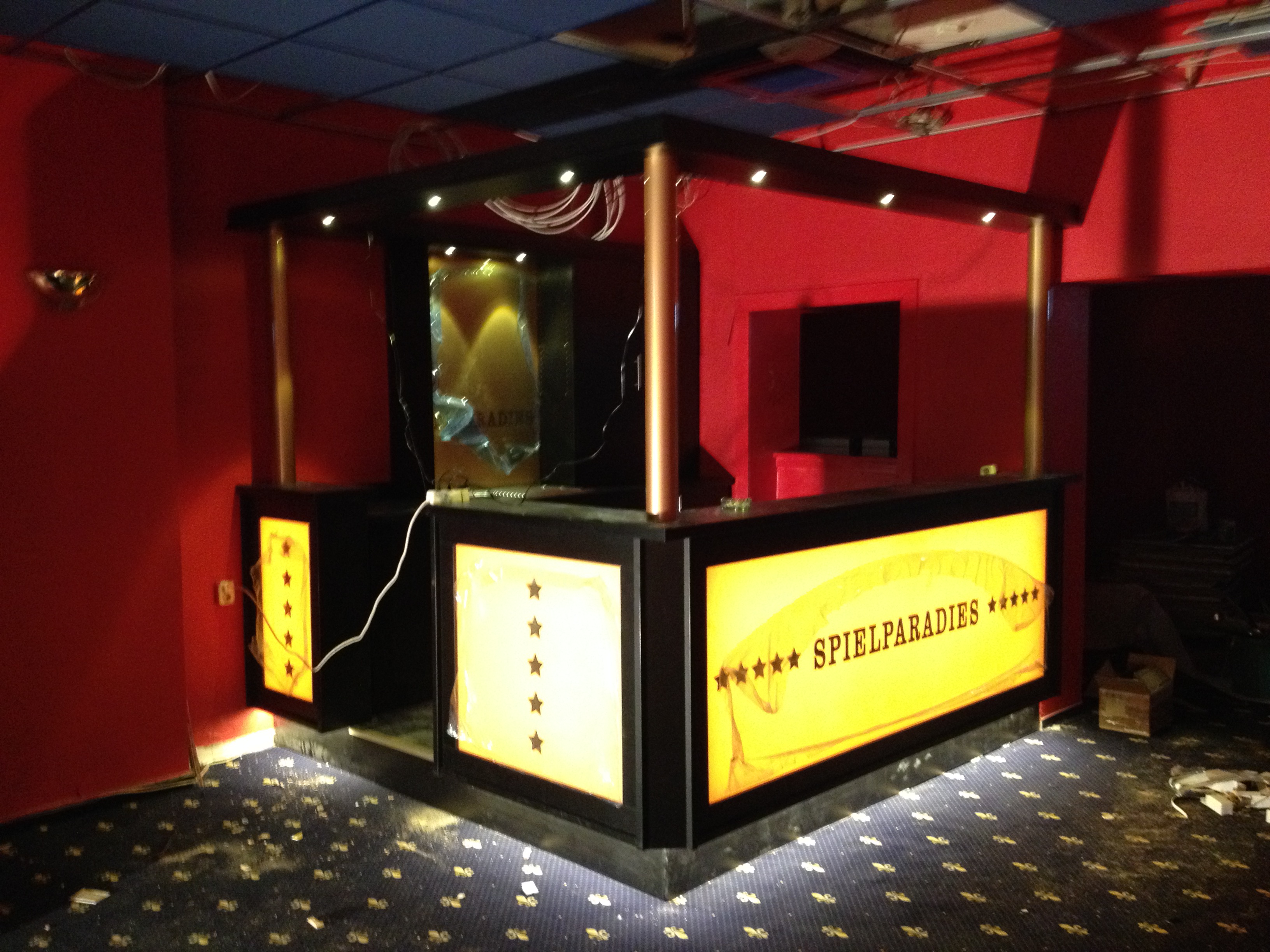 - Tresen mit eingelassenen Edelstahlstreifen und einer Überfallschutzkabine aus Sicherheitsglas