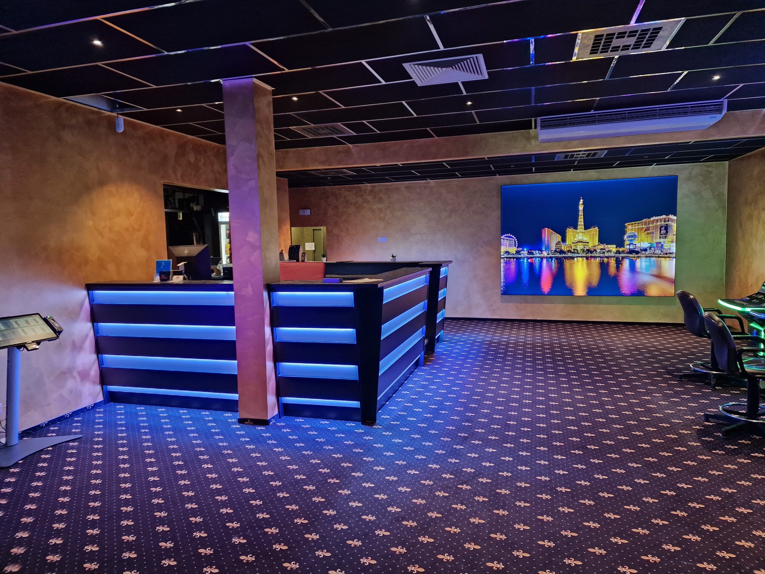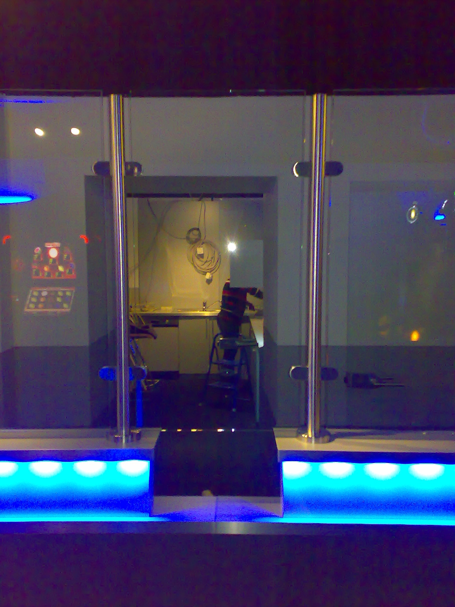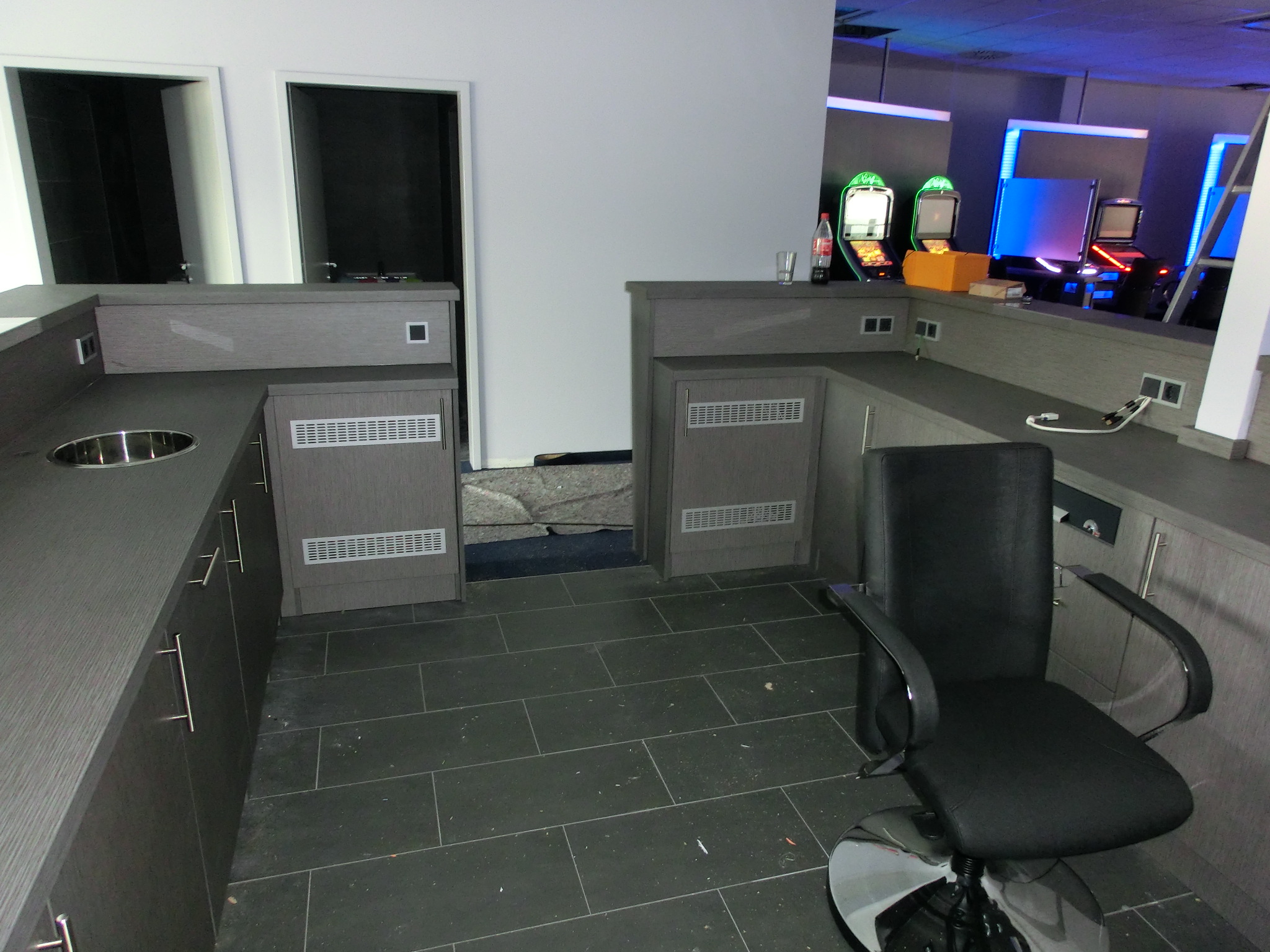- Tresen mit eingelassenen Edelstahlstreifen und einer Überfallschutzkabine aus Sicherheitsglas