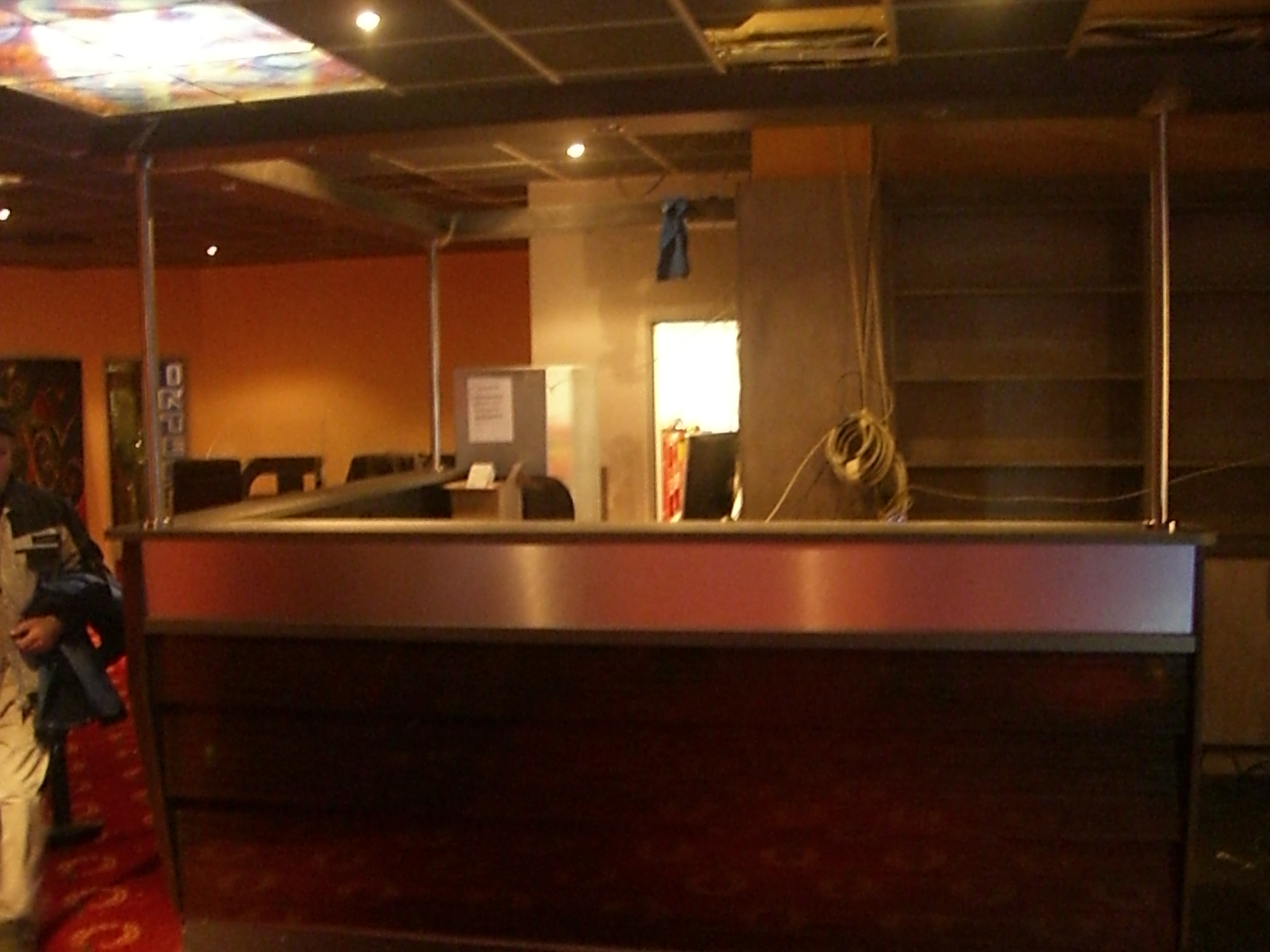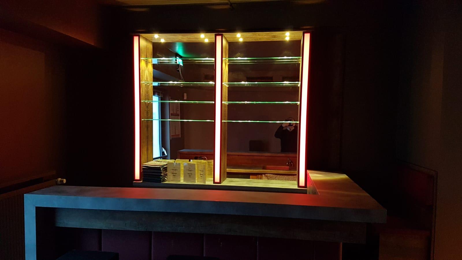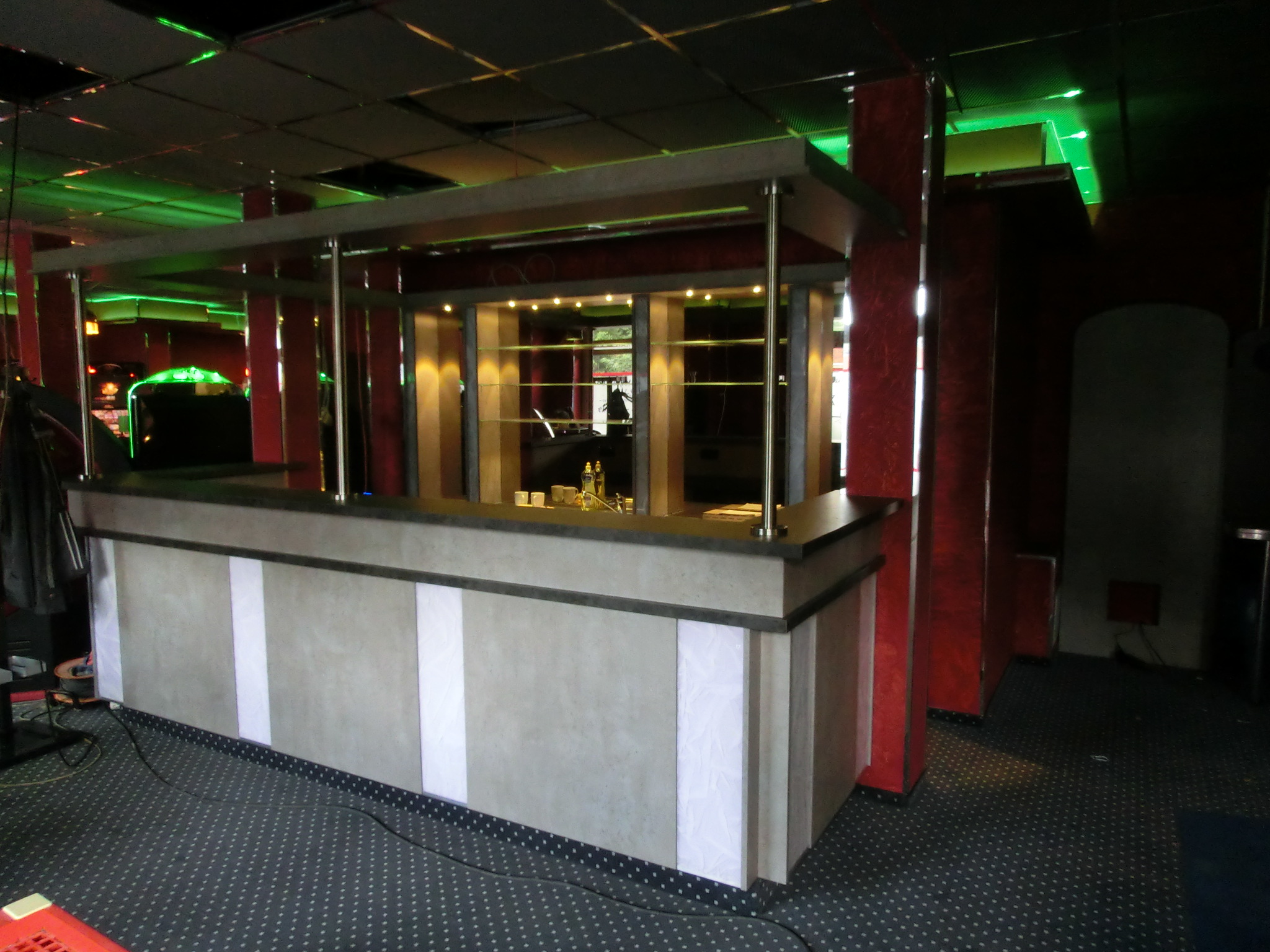 - Tresen, eckig mit einzelnen beleuchtetn Feldern, Deckenkranz und Rückbuffet
